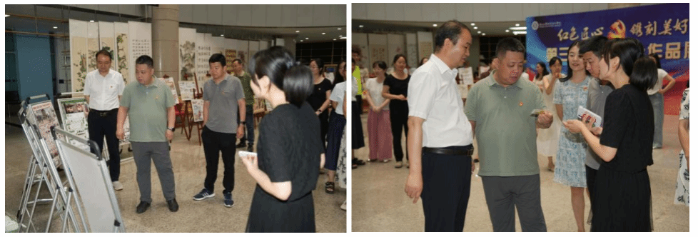 其中段峻副校长亲自前来图书馆进行现场观展指导,听取专业教师对每一件作品的讲解分析,给出了高度评价,充分肯定了我们对于文创方面和乡村建设方面的学习与探究,强调未来面对行业转型升级,我们积极探索新的方向和赛道正是时代的要求,也正是我们未来需要重点发力的地方。同时段院长了解了文创产品中冰箱贴的设计制作过程,还提出了关于我们作品展中文创板块的进一步发展可以进行专业之间的融合建设,与机械加工相关专业合作,进一步为未来专业和学校的发展进行宣传建设。