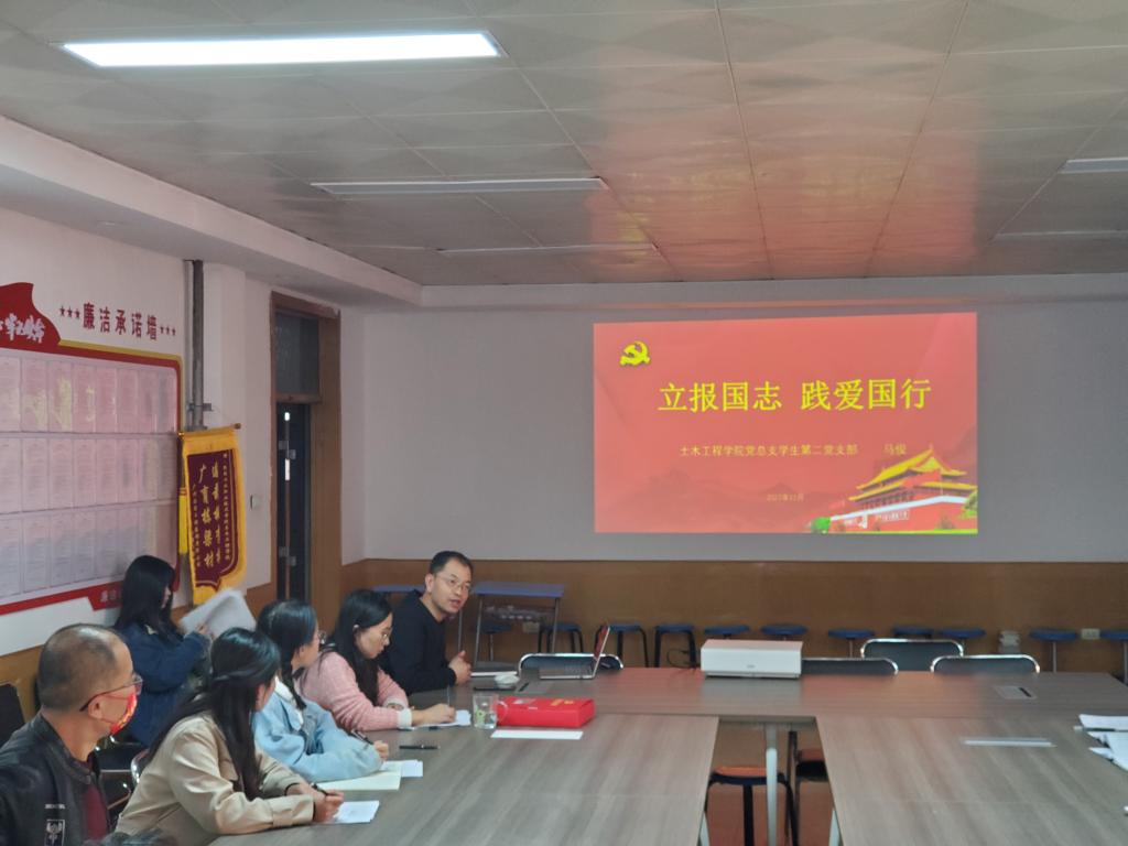 为全面推进党支部“三课一会”制度,增强党员的党性修养,11月3日,土木工程学院学生第二党支部在格物楼219党员活动室,开展了“立报国志 践爱国行”支部书记讲党课活动。本次党课由支部书记马俊主持,支部全体党员参会。