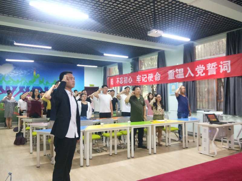 在国际歌结束后,毕业生党员樊毅龙带领全体党员面对党旗重温了入党誓词。支部书记韩二豹要求全体毕业生党员,在步入社会后不要忘记自己的党员身份,在工作中能以身作则,发挥先锋模范作用,同时坚定理想信念,做好表率。最后,入党积极分子和发展对象以《我骄傲,我是中国人》为题进行了诗朗诵,表达了对祖国的热爱和对毕业生党员的祝福。