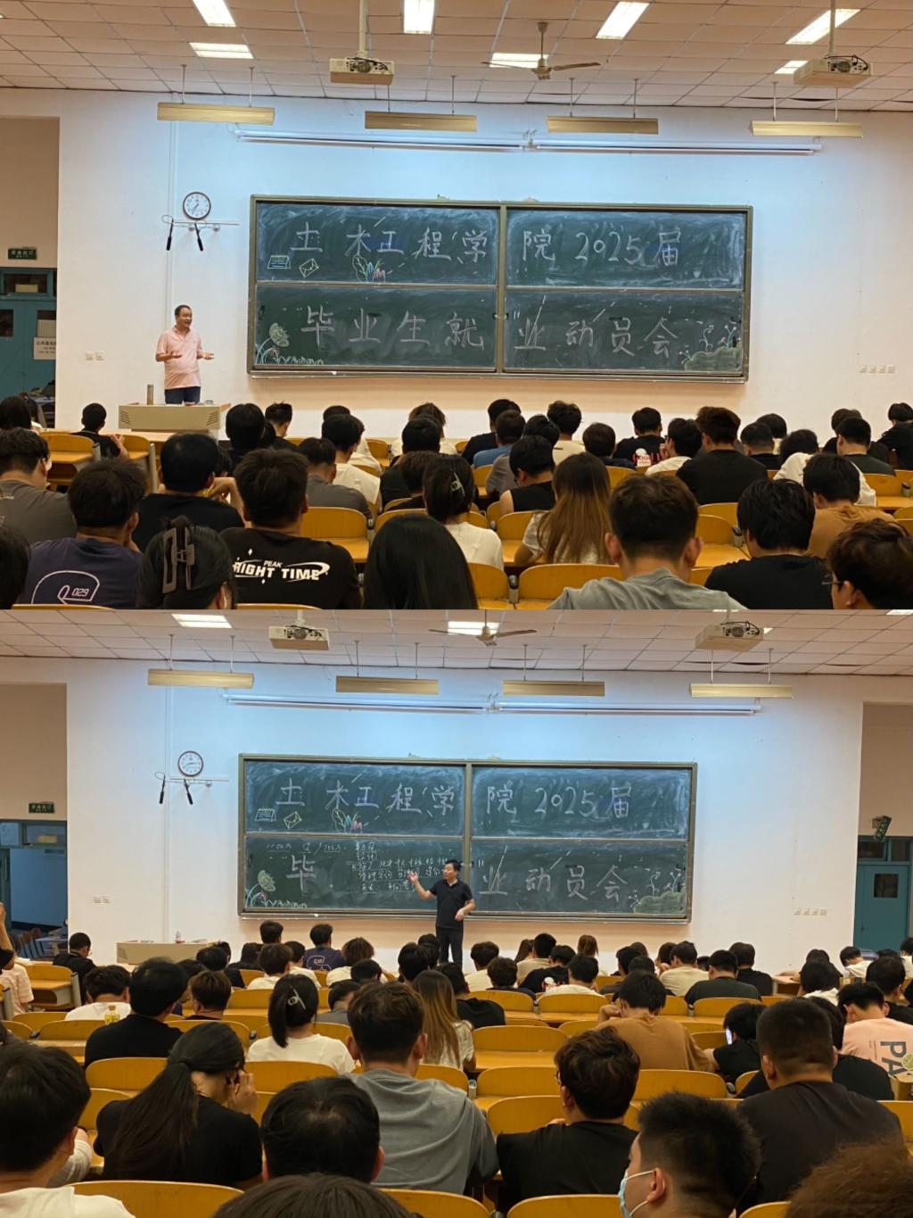 为扎实推进2025届毕业生就业工作,让毕业生充分了解就业形势、就业政策及相关就业注意事项,树立正确科学就业观,提高2025届毕业生就业质量,9月12日晚,土木工程学院2025届毕业生就业动员大会在崇文西楼301和302教室举行。土木工程学院党总支书记卢文澈和院长杨谦、学工办主任马俊、2025届毕业生辅导员以及900余名2025届毕业生参加本次会议。