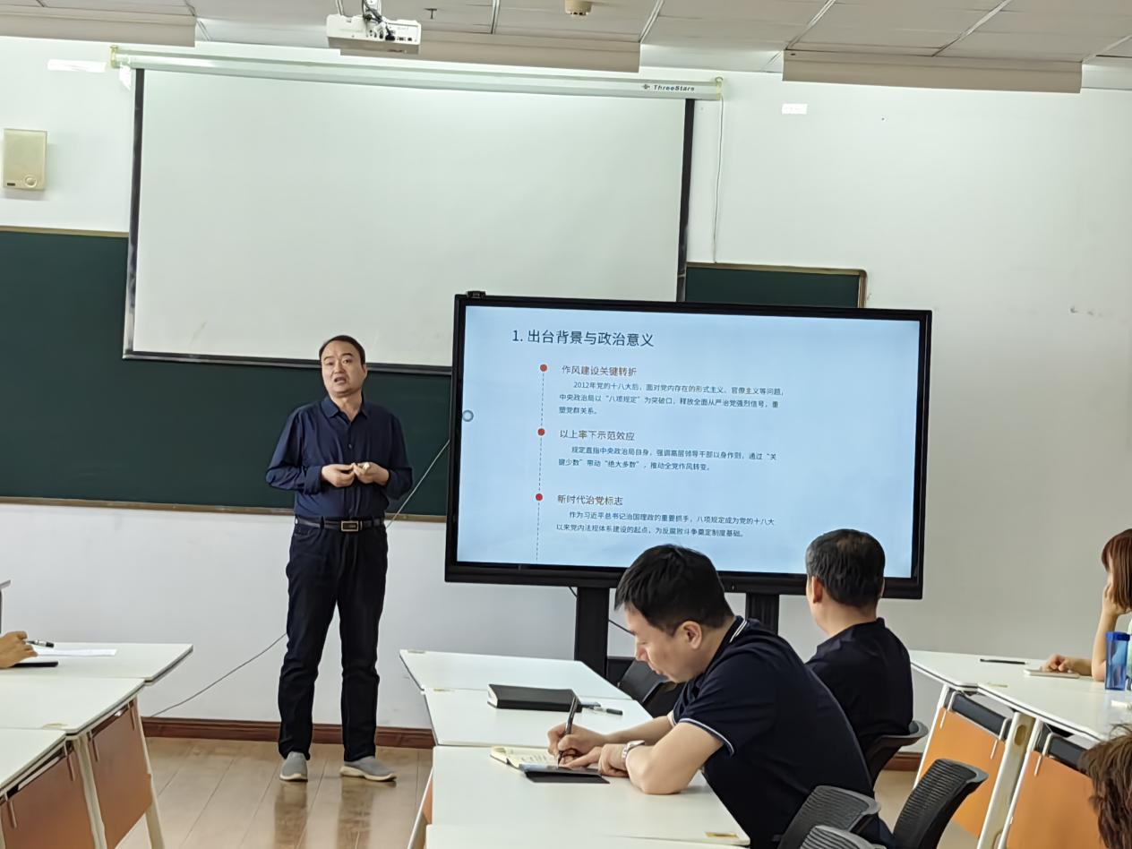 会议强调,学院全体党员教师要担起关键责任,增强思想自觉、政治自觉、行动自觉,高标准、严要求开展学习教育,带头全面系统学习习近平总书记重要论述的丰富内涵和实践要求。要严格对标对表,抓好各项任务落地落实对标“学有质量”,坚持个人自学与集中学习相结合,推动学习教育成果转化为高质量发展实效;对标“查有力度”,全面深入查找落实中央八项规定及其实施细则精神方面存在的问题,切实把准问题;对标“改有成效”,主动认领责任,扎实推进集中整治,健全完善长效机制,促进作风建设常态化、长效化。