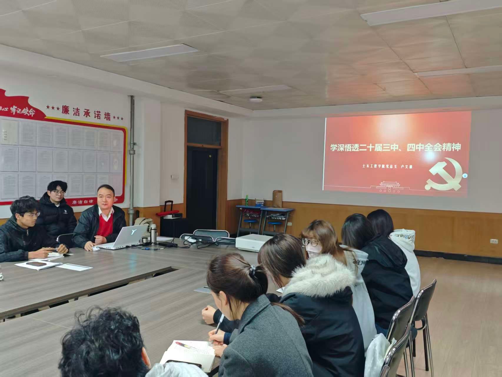 为深入学习宣传贯彻党的二十届四中全会精神,引导学院师生深刻把握全面建设社会主义现代化国家的战略部署,11月12日下午,土木工程学院党总支书记卢文澈同志以"学深悟透二十届三中、四中全会精神"为主题,为土木师生党员、入党积极分子及教师代表讲授专题党课。