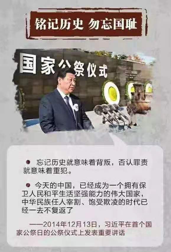 2014年12月13日,中国共产党和国家主要领导人出席首个国家公祭日。国家主席习近平在公祭日上讲到:南京大屠杀惨案铁证如山、不容篡改。