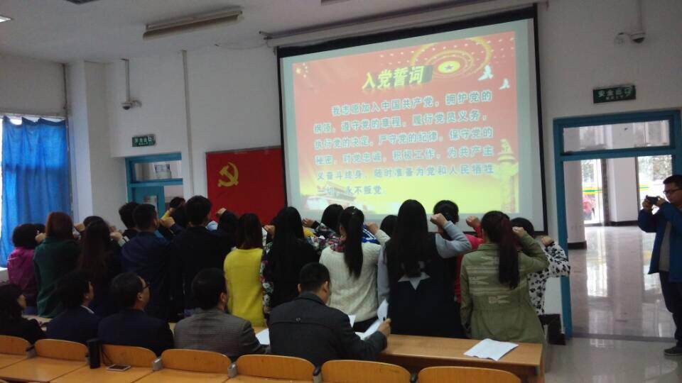 会议由学生工作支部书记韩二豹主持,会议在《国际歌》中开始,党委组织部候涛科长宣读了党委关于新发展党员的审批意见,全体新党员面向党旗,庄严宣誓。老党员代表孙伟及新党员代表黄伟栋做了发言,他们的发言道出了所有党员的心声,表达了自己作为一名大学生党员,恪守在党旗下的诺言,发挥自身的先锋模范带头作用,努力使自己成为一名优秀共产党员的决心和信心。